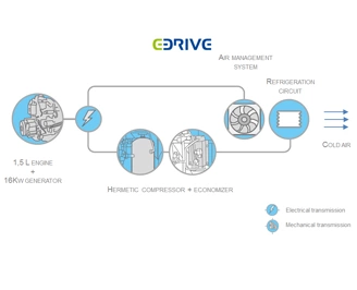 Агрегат Vector 1550 оборудован запатентованной технологией E-Drive. Благодаря увеличению мощности экономайзера был уменьшен размер герметичного компрессора и объем двигателя.